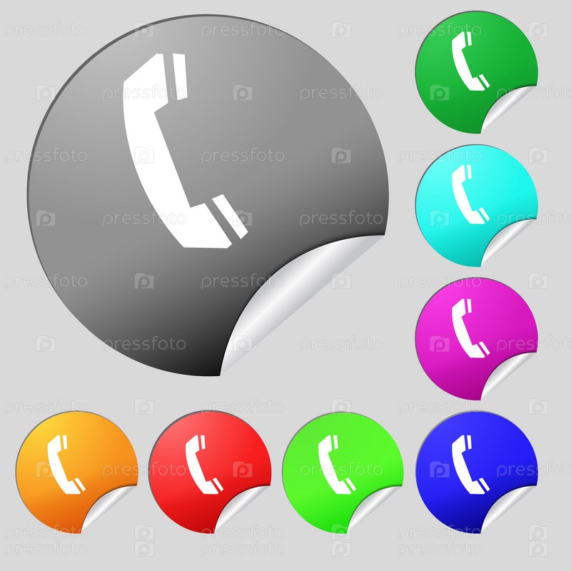 Знак значка телефона. символ поддержки. call center. набор из восьми многоцветных круглых кнопок, стикеров. вектор