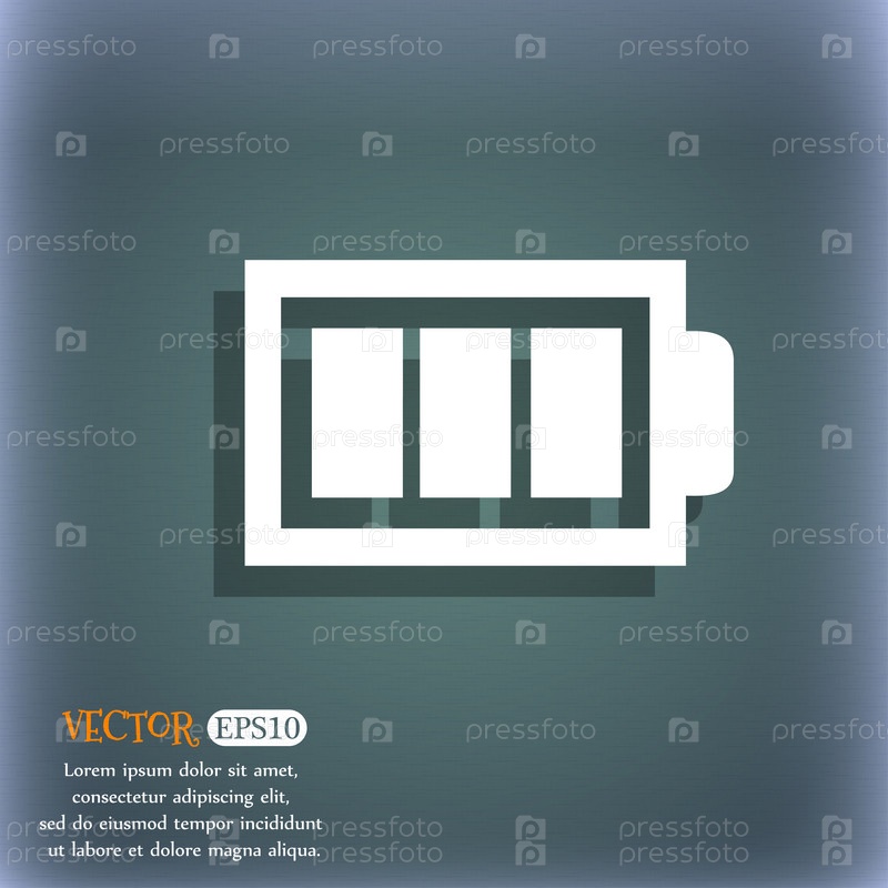Аккумулятор полностью заряжен знак значок. Символ электроэнергии. На сине зеленый абстрактный фон с тенью и пространства для вашего текста. Вектор