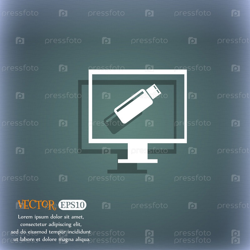 Флэш-накопитель USB и монитор значок символа. символ видеоигры. на синем зеленом абстрактном фоне с тенью и пробелом для вашего текста. вектор