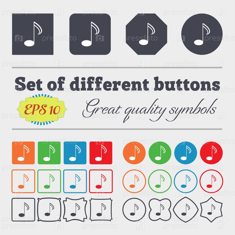 Музыка Примечание знак значок. Музыкальным символом. Большой набор красочных, разнообразных, высококачественных кнопок. Вектор
