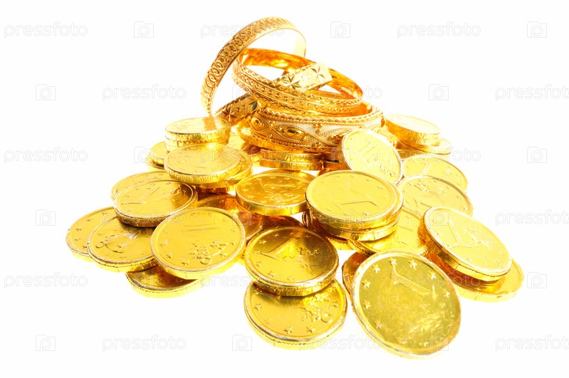 Золотые монеты и браслеты на белом фоне