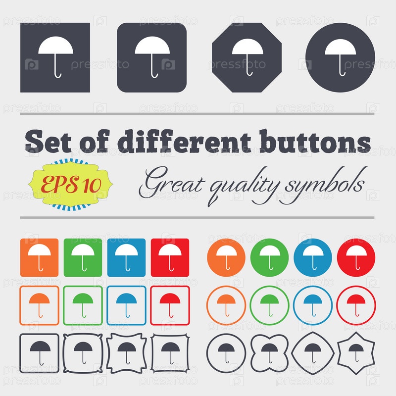 Зонтик знак значок. Символ защиты дождя. Большой набор красочных, разнообразных, высококачественных кнопок. Вектор