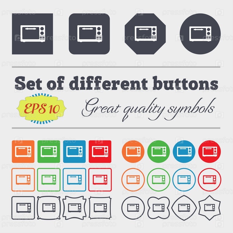 Микроволновая печь знак значок. Электрическая плита символ. Большой набор красочных, разнообразных, высококачественных кнопок. Вектор