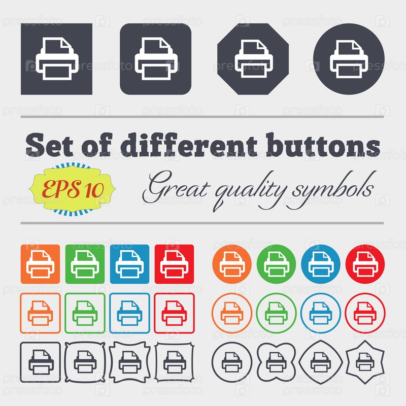 Распечатайте изображение знака. Символ печати. Большой набор красочных, разнообразных, высококачественных кнопок. Вектор