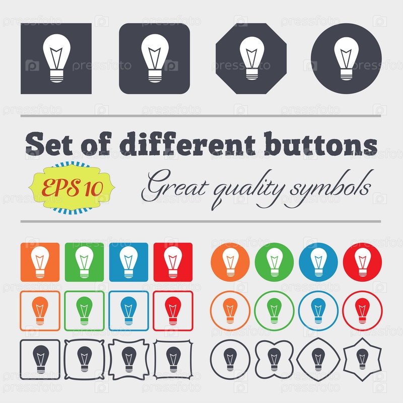 Свет лампы знак значок. Символ, идея. Большой набор красочных, разнообразных, высококачественных кнопок. Вектор