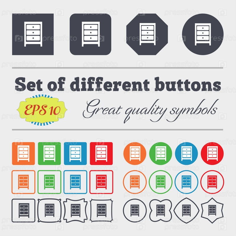 Тумба прикроватная значок знак. Большой набор красочных, разнообразных, высококачественных кнопок. Вектор