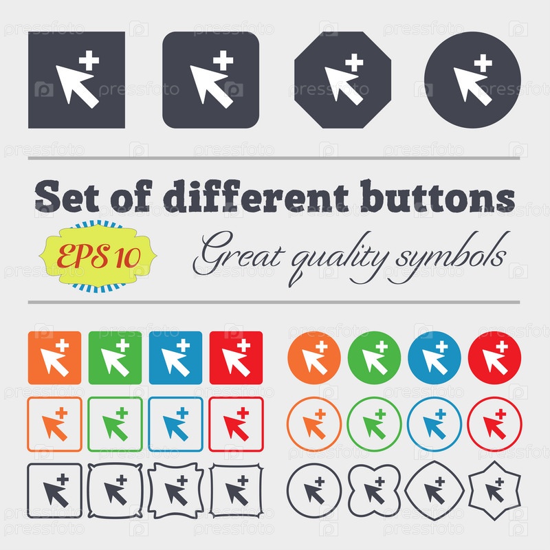 Курсор, стрелку плюс, добавьте значок знак. Большой набор красочных, разнообразных, высококачественных кнопок. Вектор