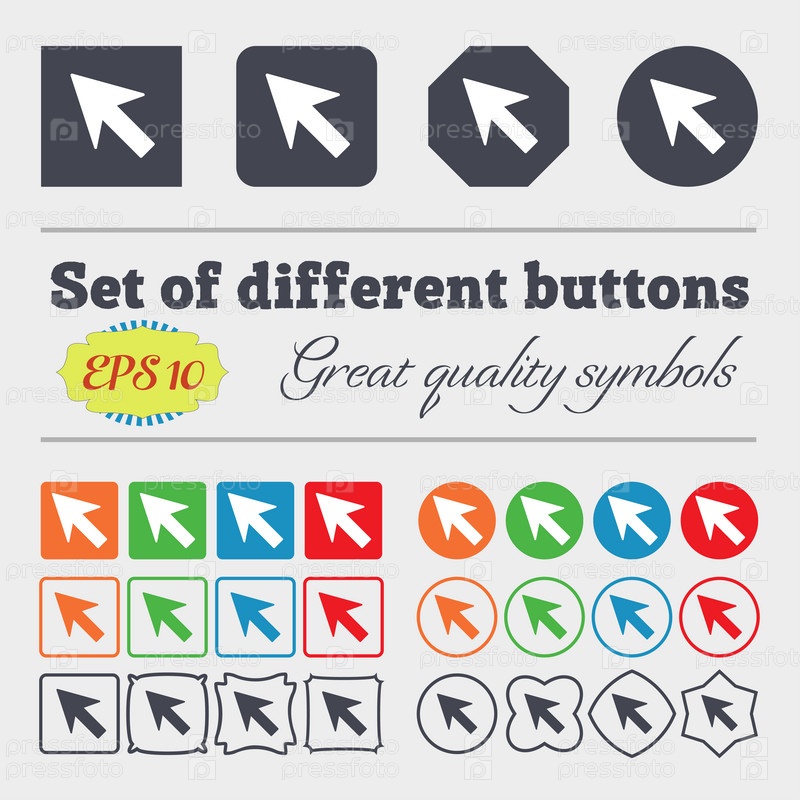 Курсор, знак значок стрелки. Большой набор красочных, разнообразных, высококачественных кнопок. Вектор
