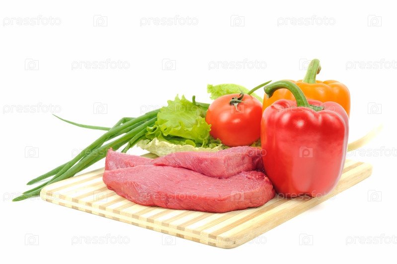 Сырая говядина с овощами на разделочной доске, изолированные на белом фоне