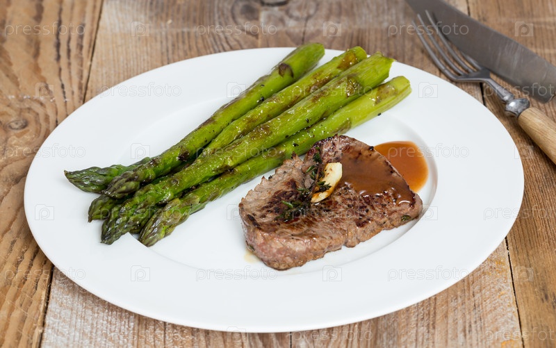 Зеленая спаржа с соусом из и стейк из говядины