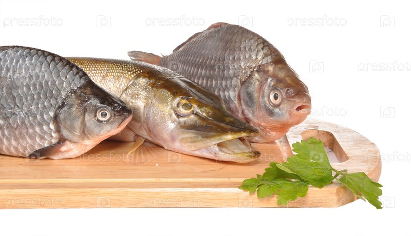 Окуни и щука на деревянной доске