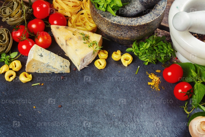 Итальянская еда, макаронные изделия, сыр, овощи и специи