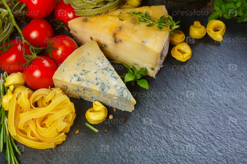 Итальянская еда, макаронные изделия, сыр, овощи и специи