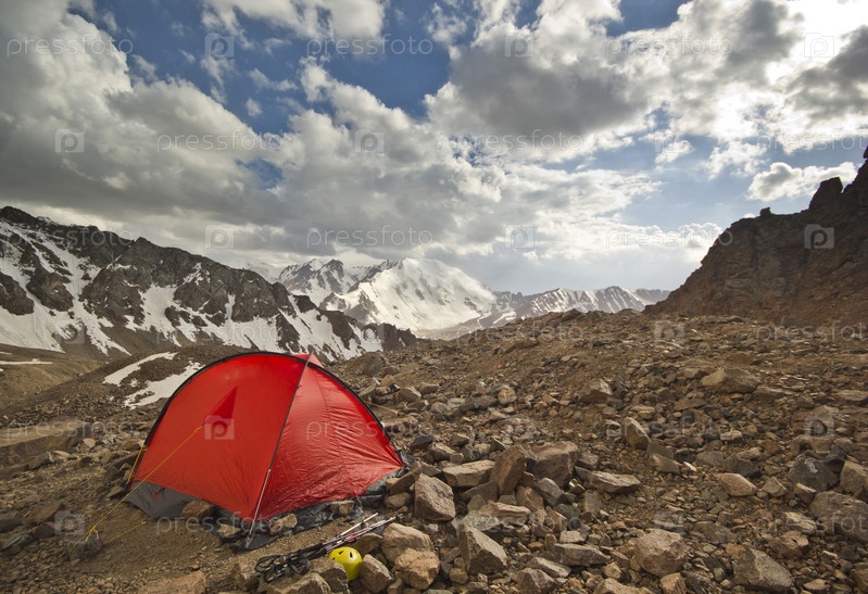 Красная палатка в высоких горах