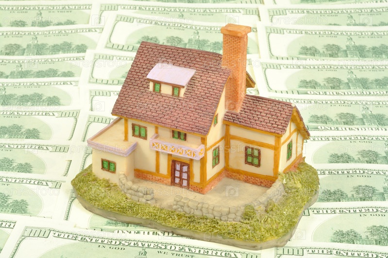 Игрушечный дом на фоне американских долларов, крупный план