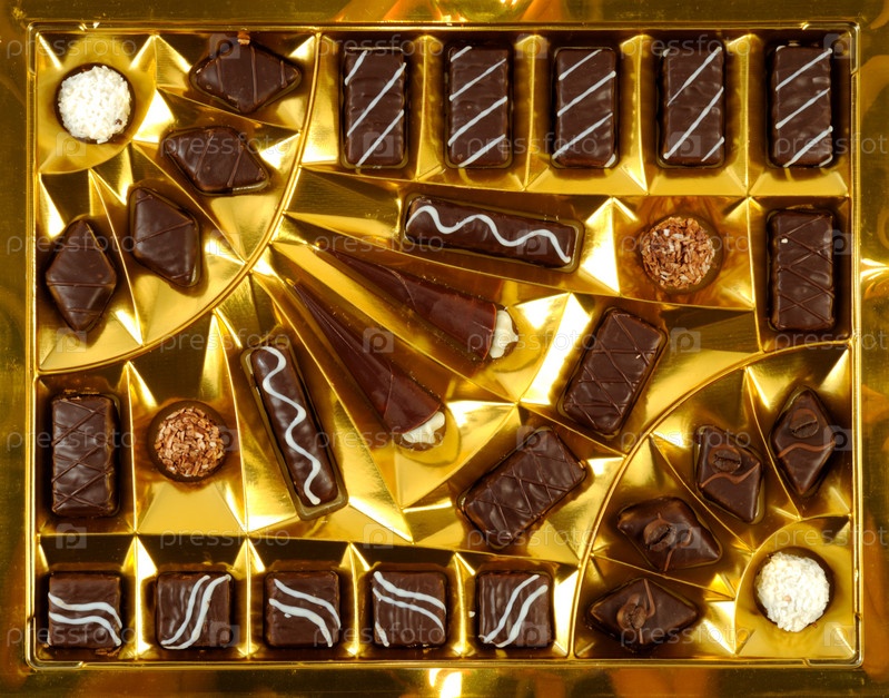Шоколадные конфеты, в открытой золотой коробке