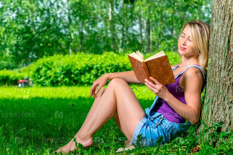 Привлекательные молодая женщина, читая роман в парке, сидя возле дерева