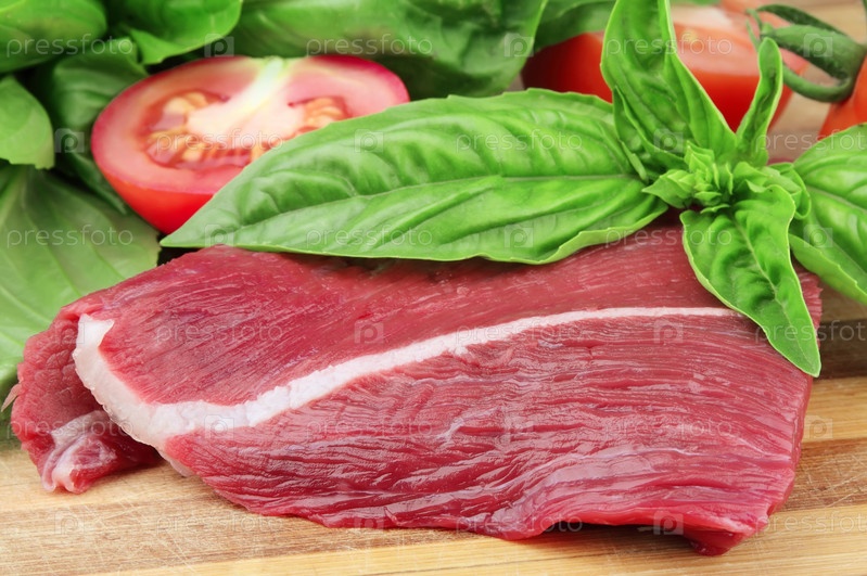 Кусок свежего мяса, базилик и помидор на деревянной доске