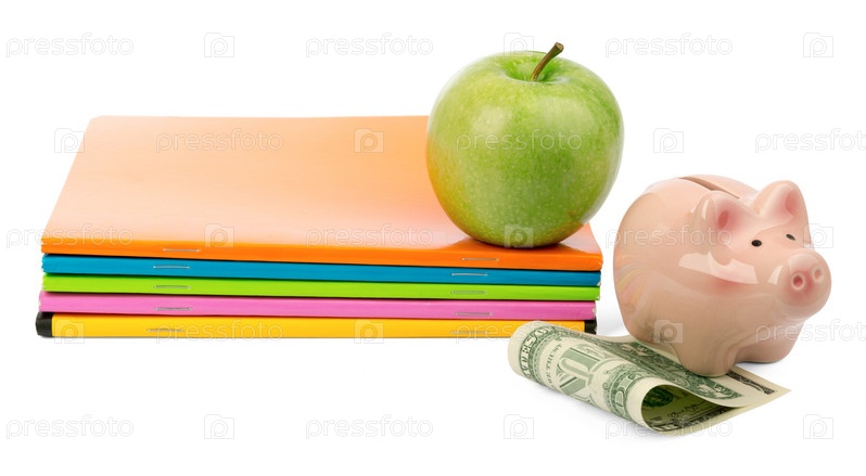 Зеленое яблоко с блокнотом, наличные и Копилка