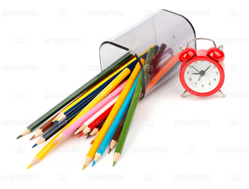 Цветные карандаши и красный будильник