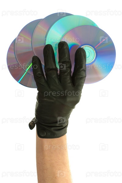 Рука в черной перчатке, удерживающая диски CD или DVD изолированные на белом фоне
