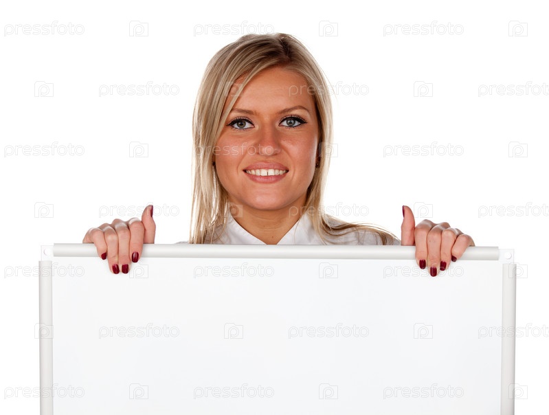 Довольная блондинка с белой доской