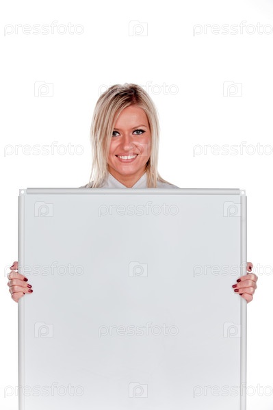 Довольная блондинка с белой доской