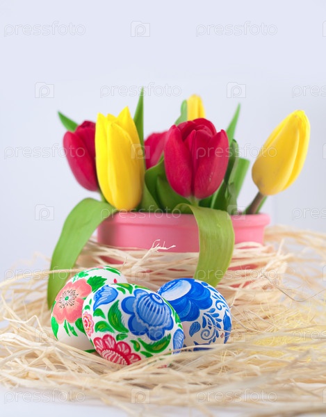 Пасхальная композиция из тюльпанов и яиц