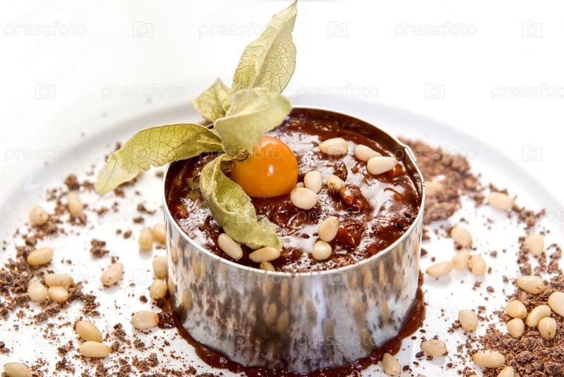 Шоколадный десерт крупным планом, изолировано на белом фоне