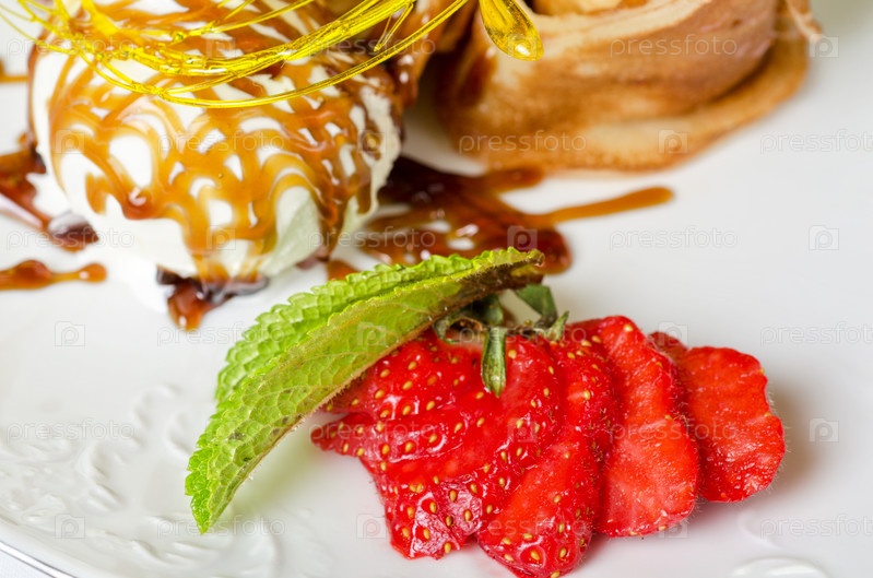 Блины с бананом, мороженым, карамелью, клубникой и мятой
