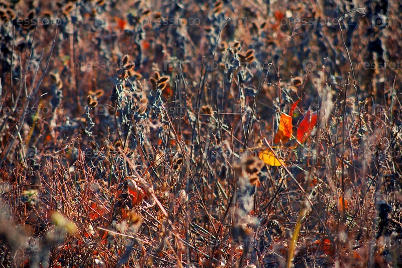 Яркий осенний лист на фоне сухой травы