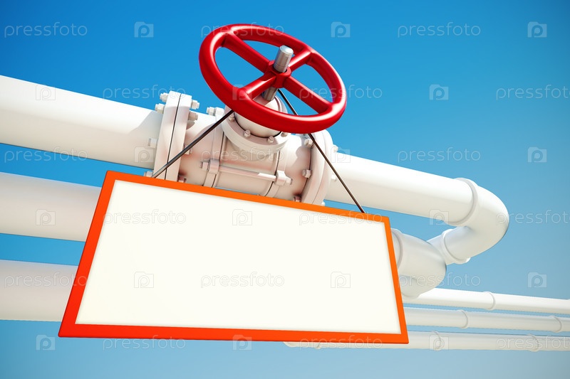 3D иллюстрации промышленных трубопроводов из газа или масла с пустым знаком на фоне синего неба