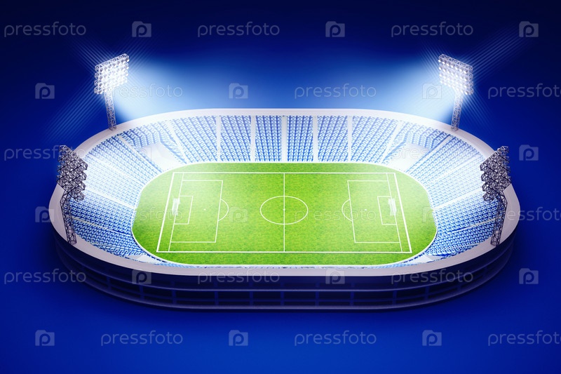 3D иллюстрация стадиона со футбольным полем с огнями на синем фоне