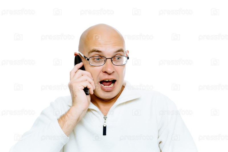 Лысый человек эмоционально общается по телефону. Изолированные. Студия