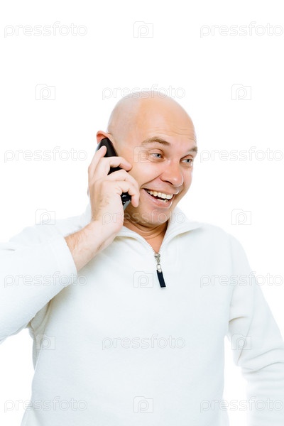 Лысый человек эмоционально общается по телефону. Изолированные. Студия