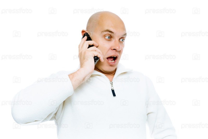 Лысый человек эмоционально общается по телефону. Изолированные. Студия