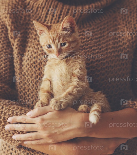 Милый котенок на руках у хозяйки