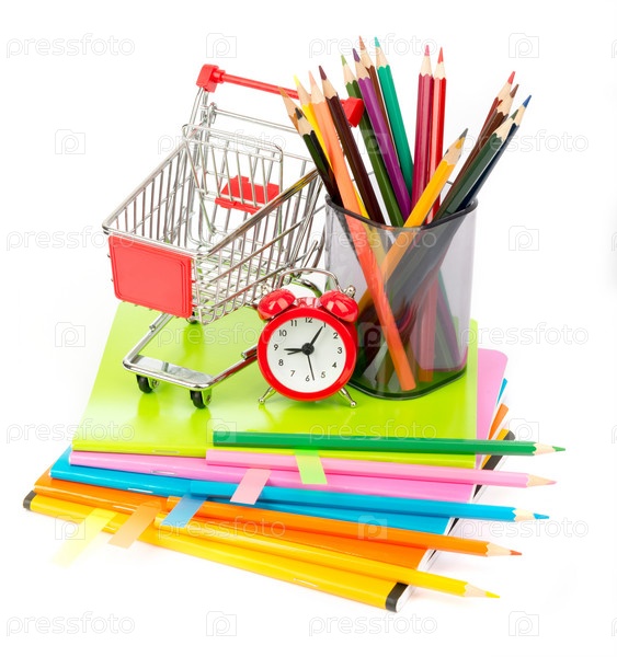 Корзина с тетради и будильник