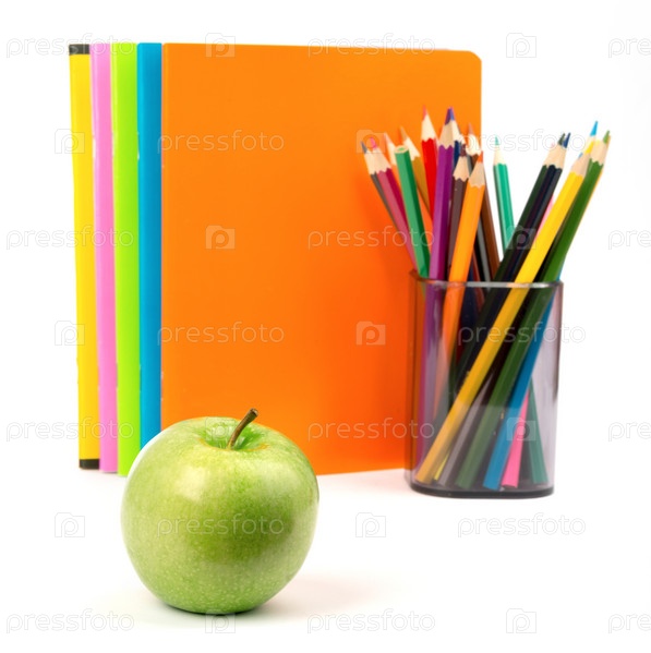 Тетради с свежими яблоками и карандашами