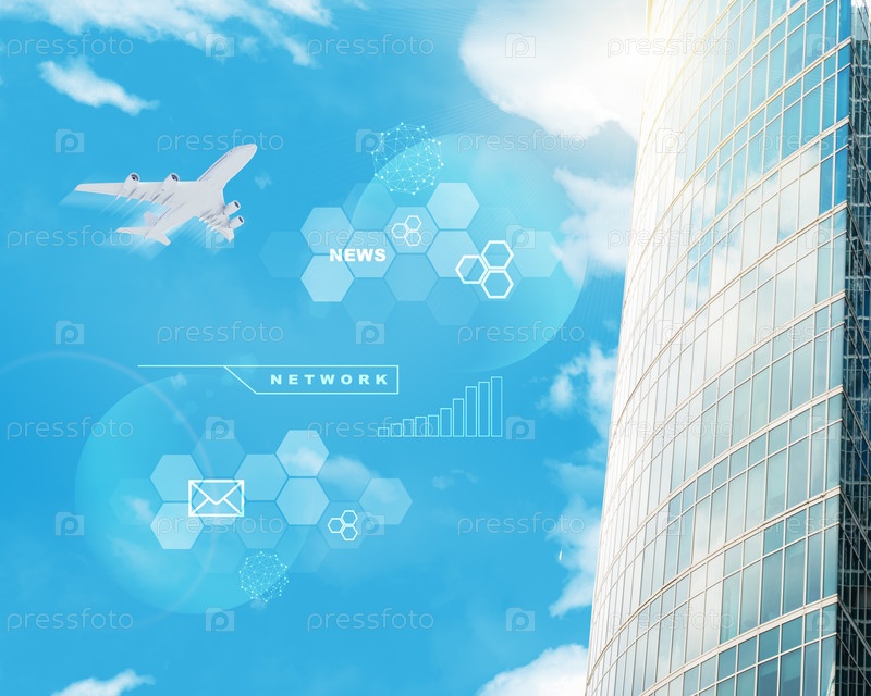 Здание с карты мира и облака на фоне голубого неба