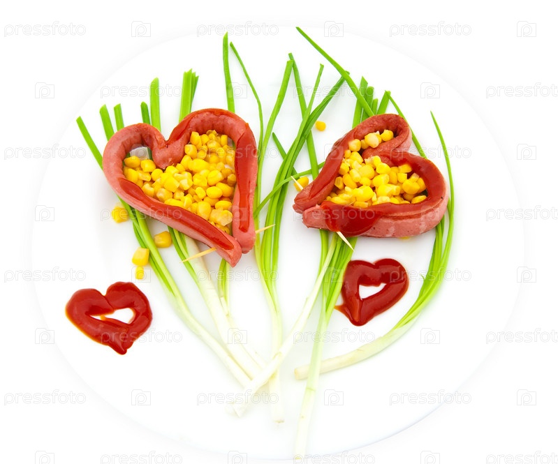 Две жареные колбасы в форме сердца с зеленым луком на белом фоне