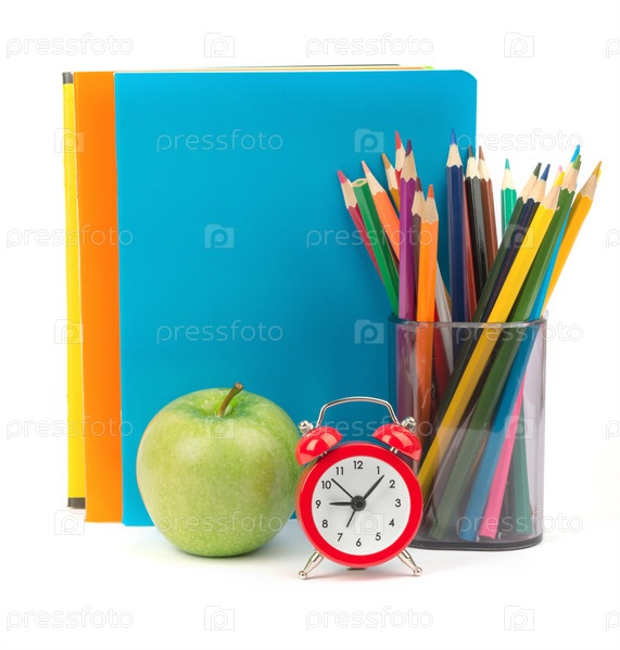 Тетради, зеленое яблоко, будильник и карандаши