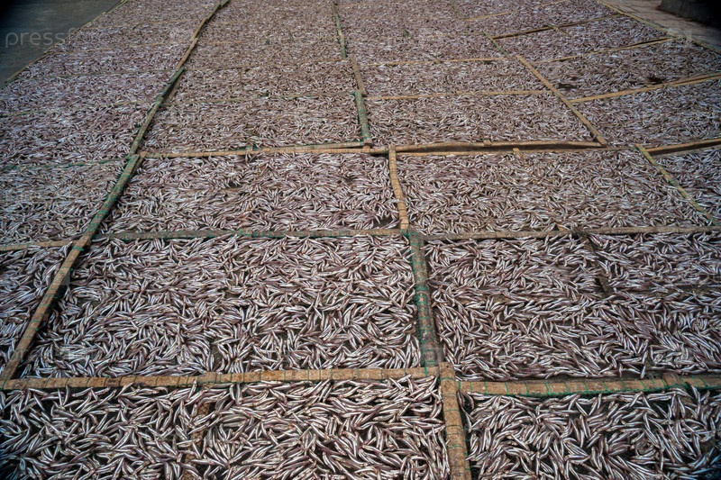 Планты маленьких анчоуса рыбы, сушка на открытом воздухе
