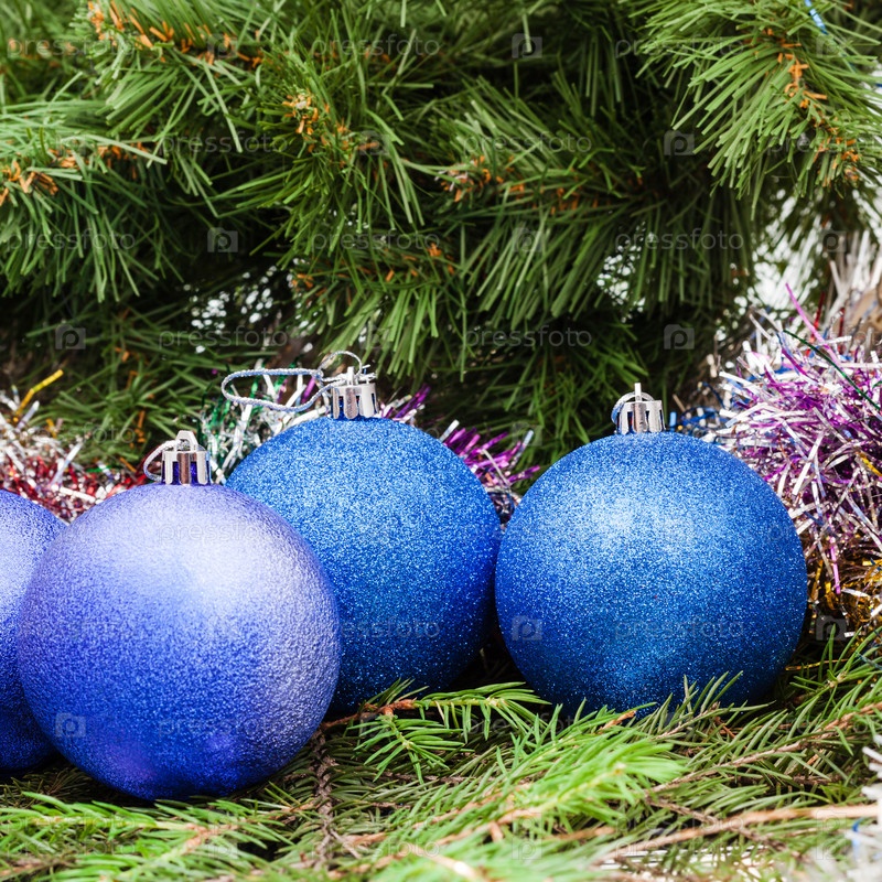Синий, Фиолетовый шарики, мишура, Рождественские елки