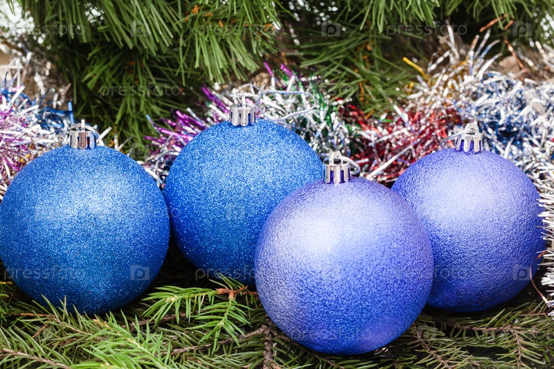 Синий, Фиолетовый шарики, мишура, Рождественские елки