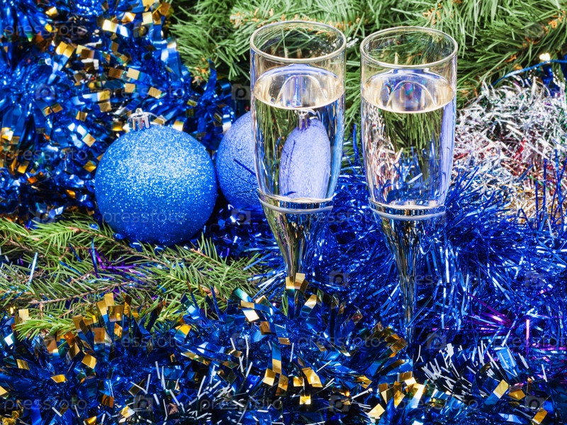 Два бокала с голубой рождественские украшения и дерево