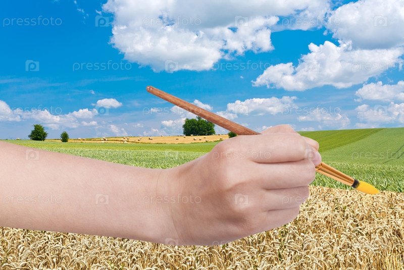 Кистью краски желтого спелой пшеницы в зеленое поле