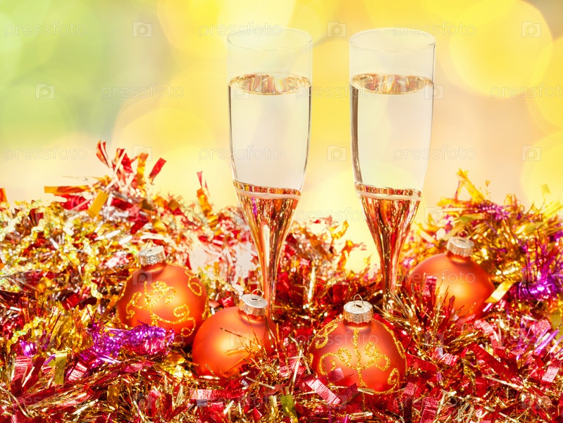 Очки, золотые новогодние шары на размытым фон