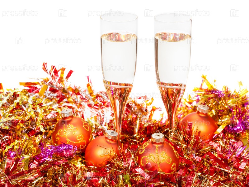 Бокалы шампанского среди новогодних украшений
