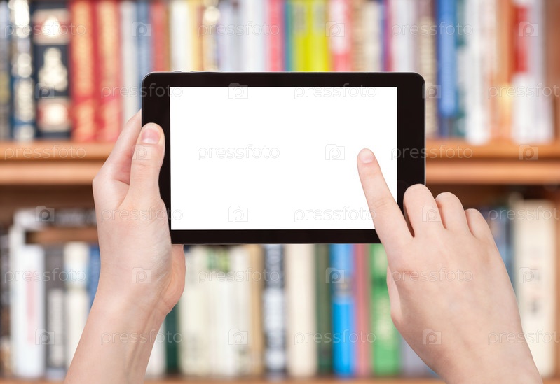 Палец касается экрана планшетного ПК и книжный шкаф